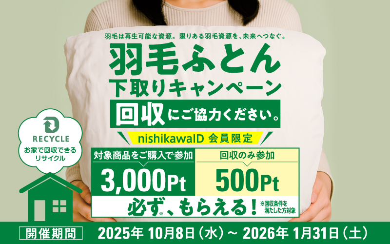- 2025年10月08日 プレスリリース 『羽毛ふとん下取りキャンペーン』 2025年10月8日(水)~2026年1月31日(土)まで開催いたします